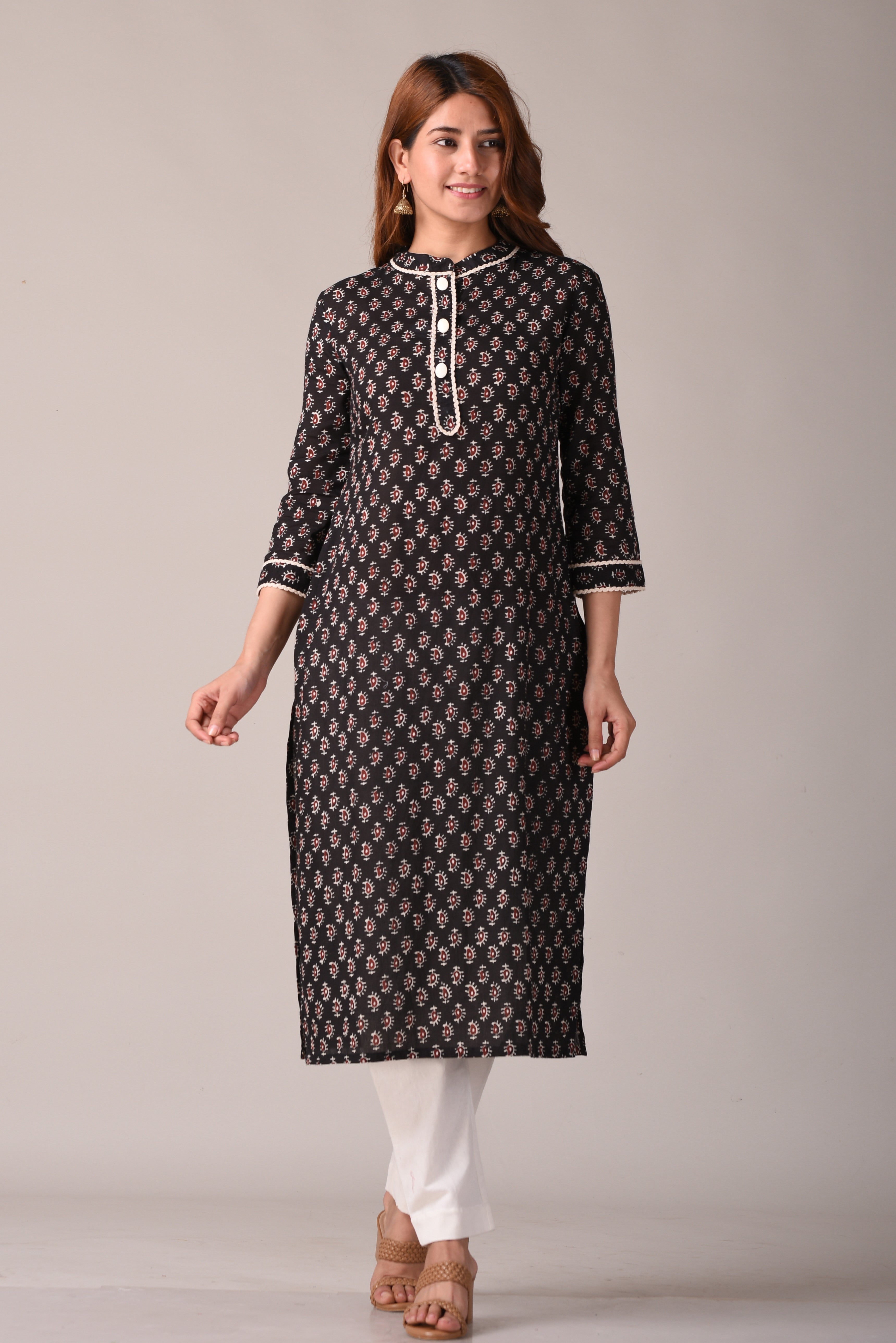 Embrace timeless sophistication with our Black Cotton Paisley Print Straight Kurta. This Ethnic Motif Printed Pure Cotton Kurti is a canvas of elegance, featuring a graceful paisley print in contrasting black and off-white hues. Crafted from pure cotton, this knee-length straight kurta boasts a classic collar, 3/4th sleeves, and a Sanganeri pattern, offering a perfect blend of ethnic charm and contemporary style.