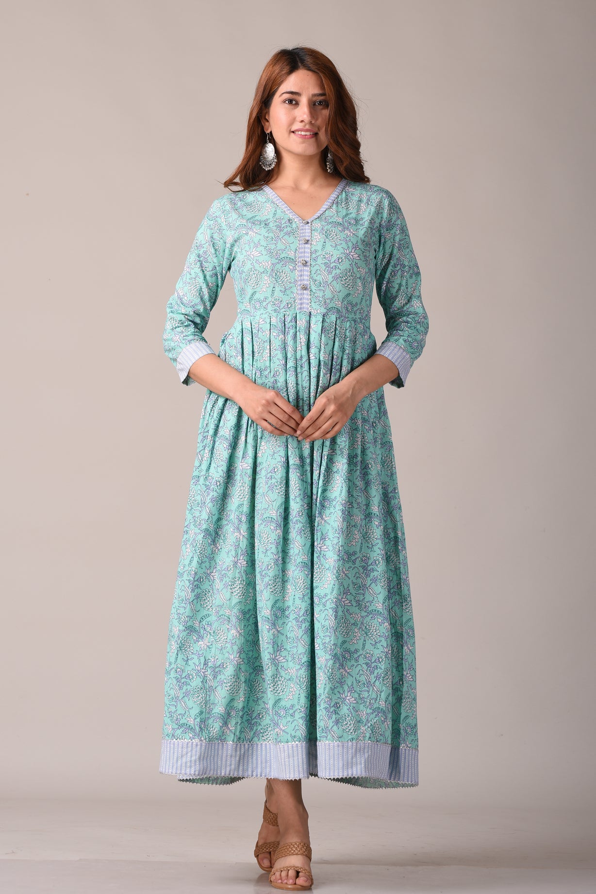 Floral Aqua Green Block Printed Pure Cotton Maxi Dress