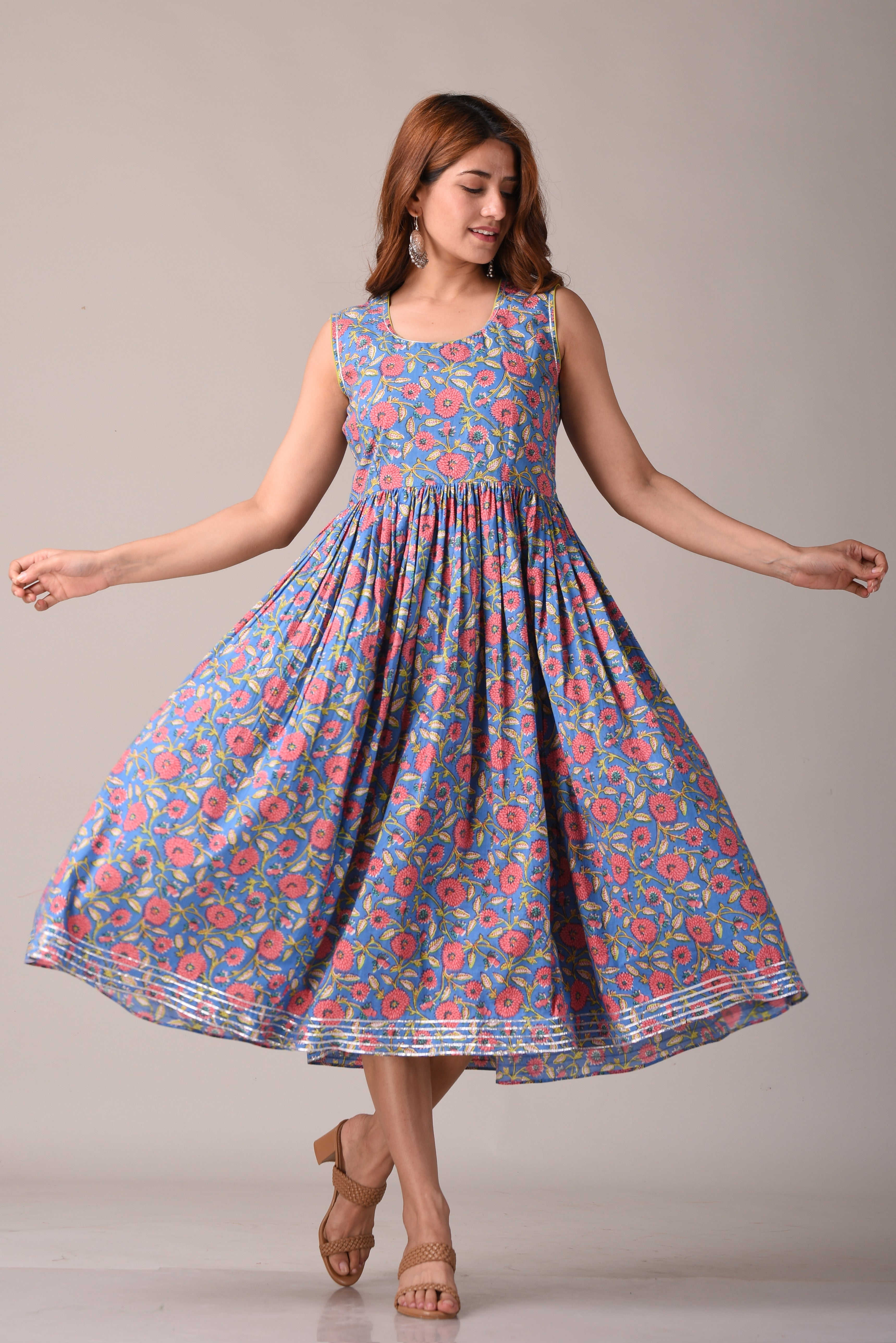 Immerse yourself in the enchanting beauty and timeless charm of our Floral Blue Printed Pure Cotton Midi Dress. This dress is a celebration of mesmerizing floral elegance, featuring a delightful blue and pink color palette that creates a creates a captivating garden of blooms, adding a touch of nature-inspired grace to your wardrobe. With a round neck, sleeveless design, and a calf-length silhouette with a flared hemline, this midi dress is crafted from pure cotton, ensuring both style and comfort in every step.