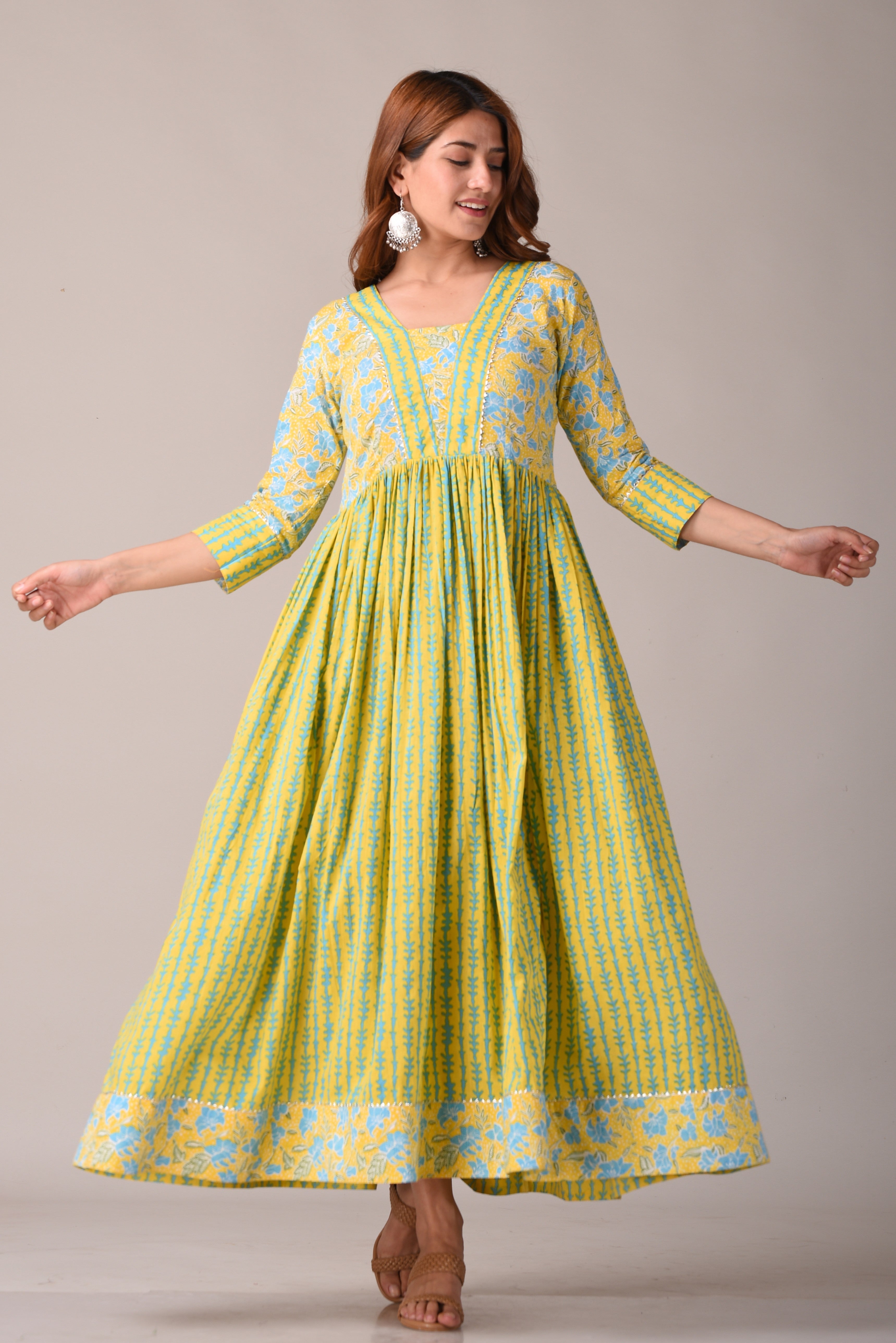 Indulge in the regal charm of our Women Floral Printed Yellow Gown, a masterpiece of Sanganeri Print. This maxi dress, adorned in a delightful yellow and light blue palette, boasts a captivating floral print and intricate gotta patti work on the neck, placket, sleeves, and bottom. With a square neck, three-quarter sleeves, and a flared hemline, this ankle-length gown is a true embodiment of grace and style, crafted from pure cotton.