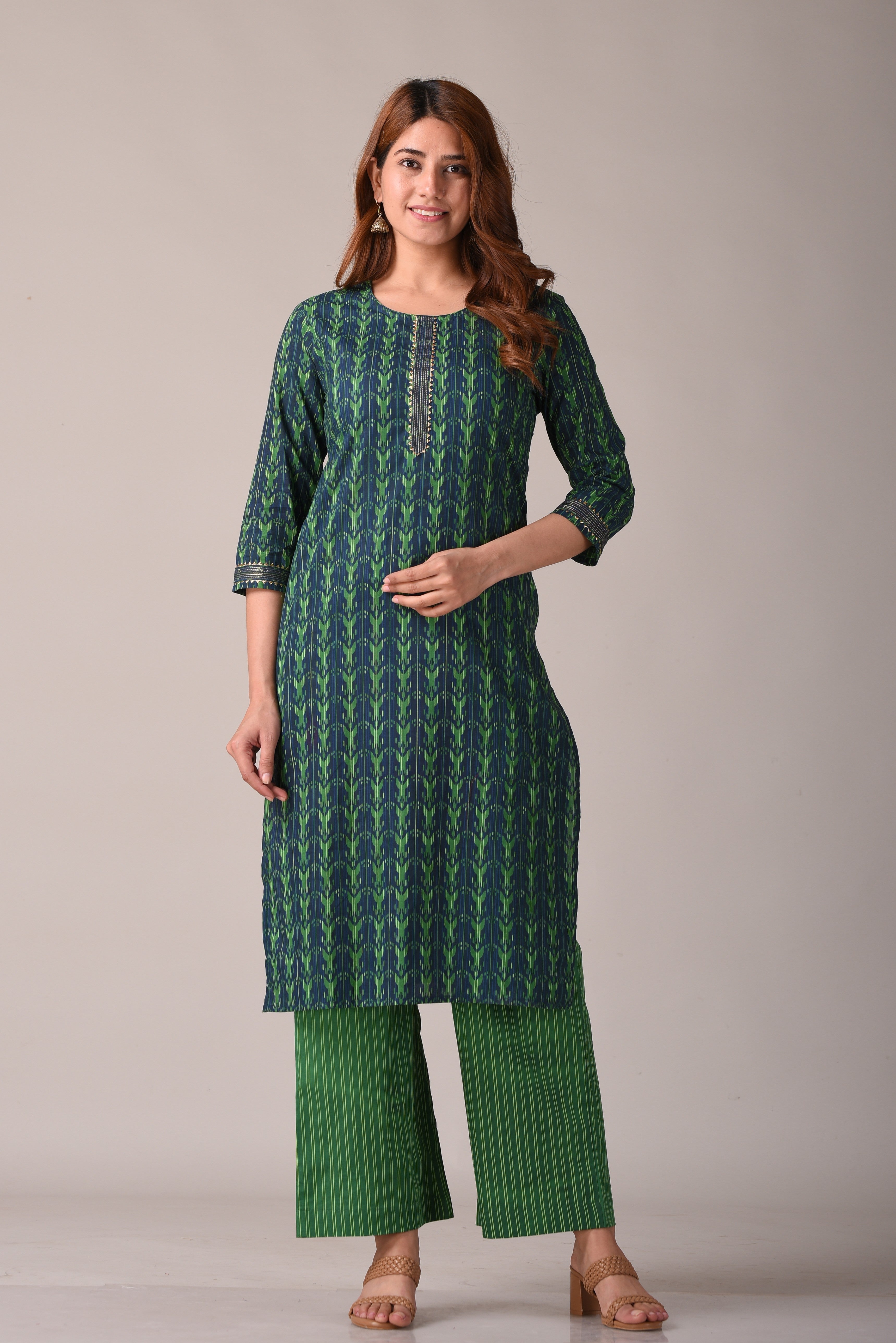 Immerse yourself in the lively allure of our Green Abstract Printed Pure Cotton Straight Kurta. This Abstract Printed Pure Cotton Kurti is a vibrant celebration of contemporary design, featuring a captivating green abstract print adorned with intricate Gota Patti detailing. Crafted from pure cotton, this knee-length straight kurta showcases a round neckline, 3/4th sleeves, and a classic Sanganeri pattern, offering a perfect blend of cultural charm and modern style.