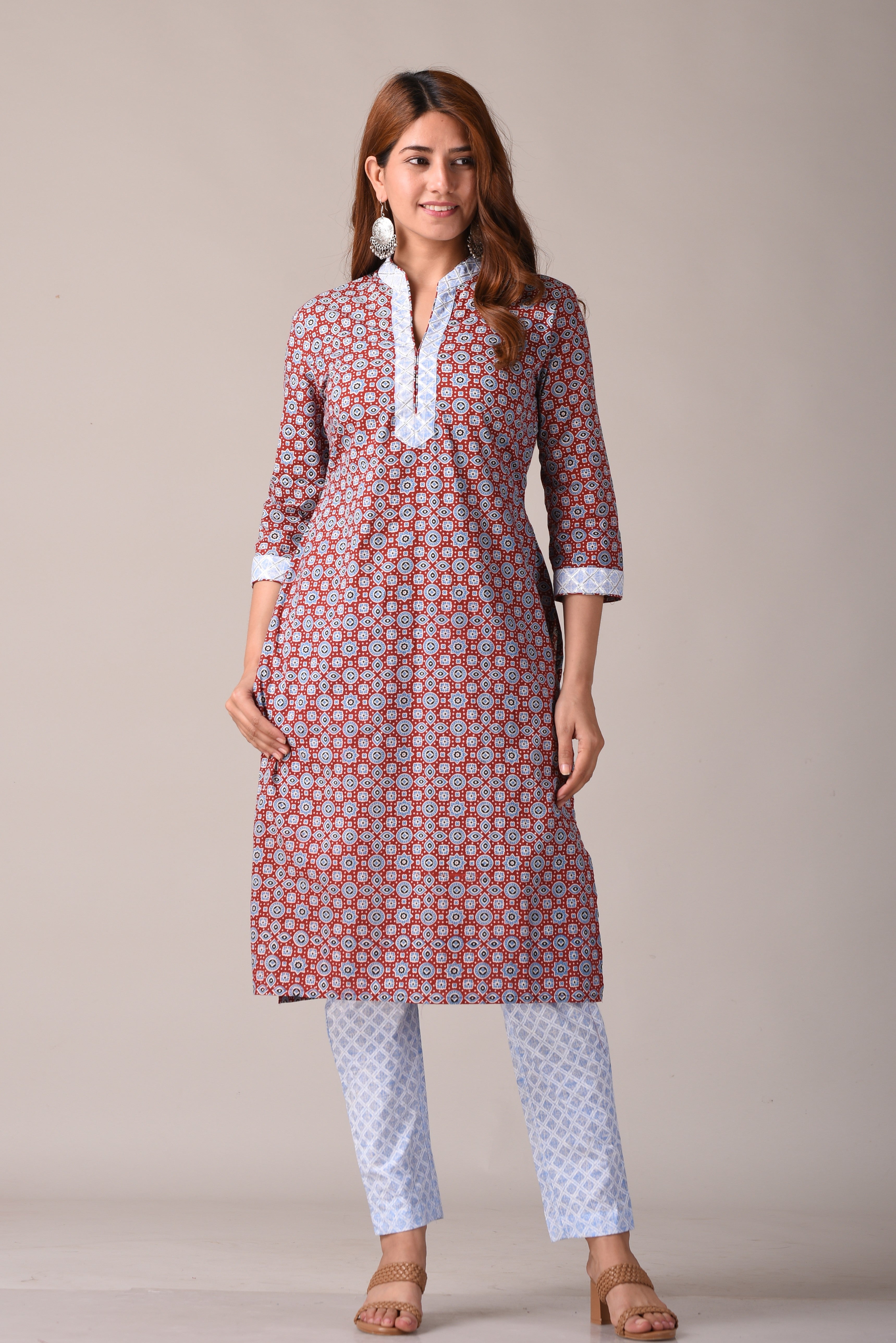 Maroon Ajrak Printed Straight Kurta