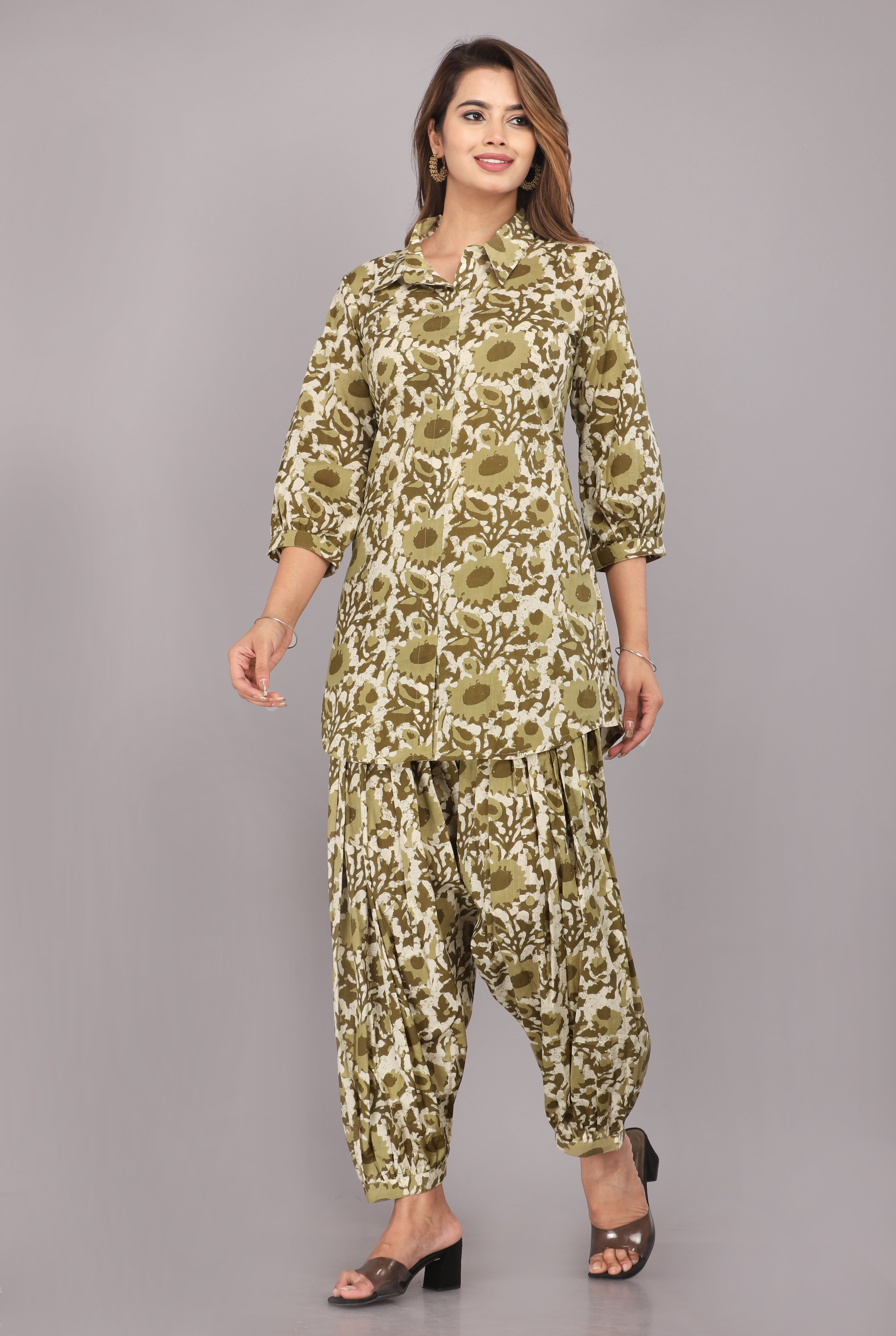 Explore the epitome of style and comfort with our Olive Floral Printed Pure Cotton Co-ord Set. This meticulously crafted ensemble features a coordinated top and bottom set, showcasing an Afghani style pant with an elasticated waist and a pocket. The top boasts a shirt collar and three-quarter sleeves, blending botanical beauty with contemporary fashion.