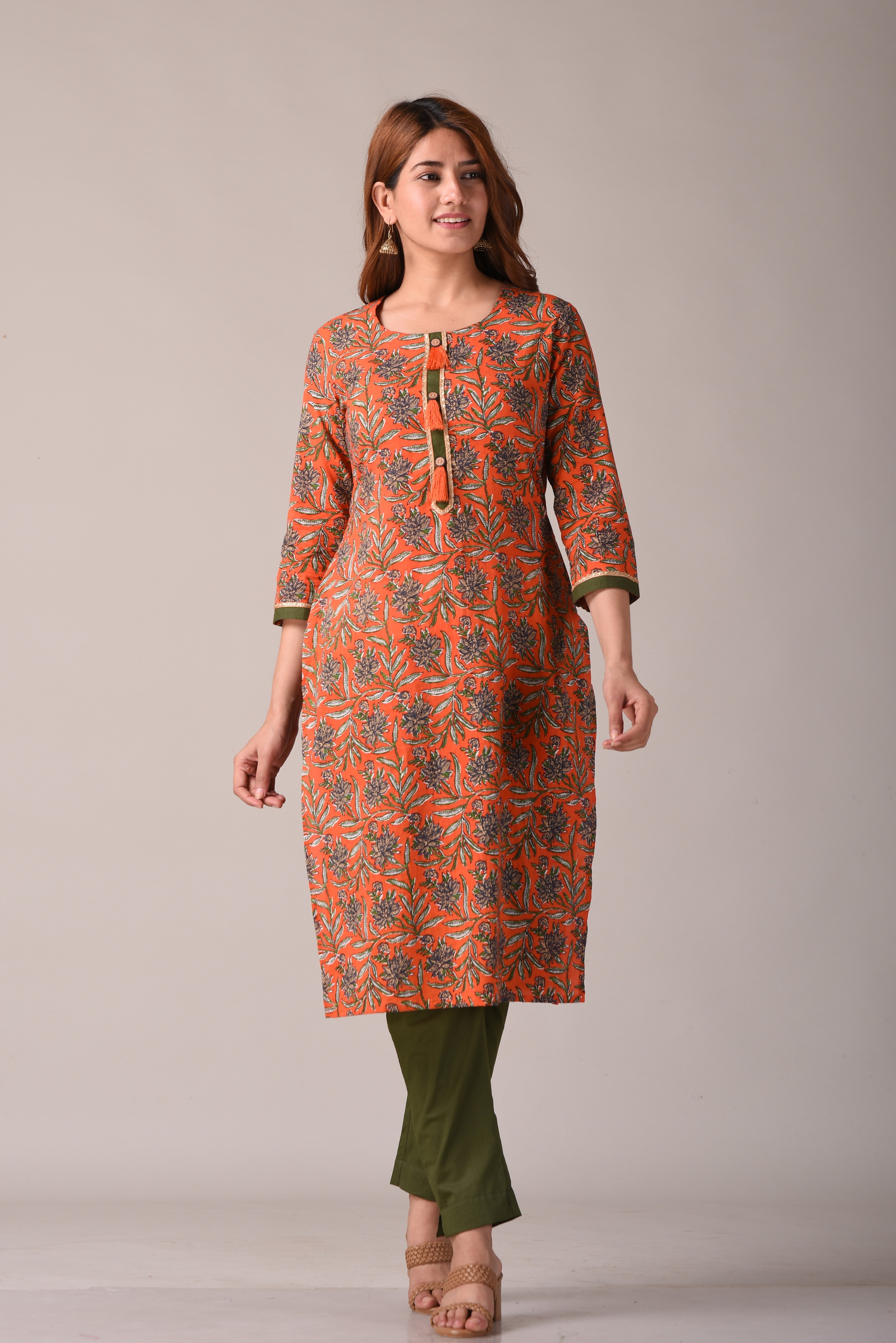 Indulge in the charm of nature with our Orange and Green Floral Printed Straight Kurta. This Floral Printed Pure Cotton Kurti is a testament to the beauty of botanical elegance, featuring a delightful combination of orange and green floral prints. Crafted from pure cotton, this knee-length straight kurta boasts a round neckline, 3/4th sleeves, and exquisite Gota Patti embellishments, offering a perfect blend of floral finesse and traditional allure.
