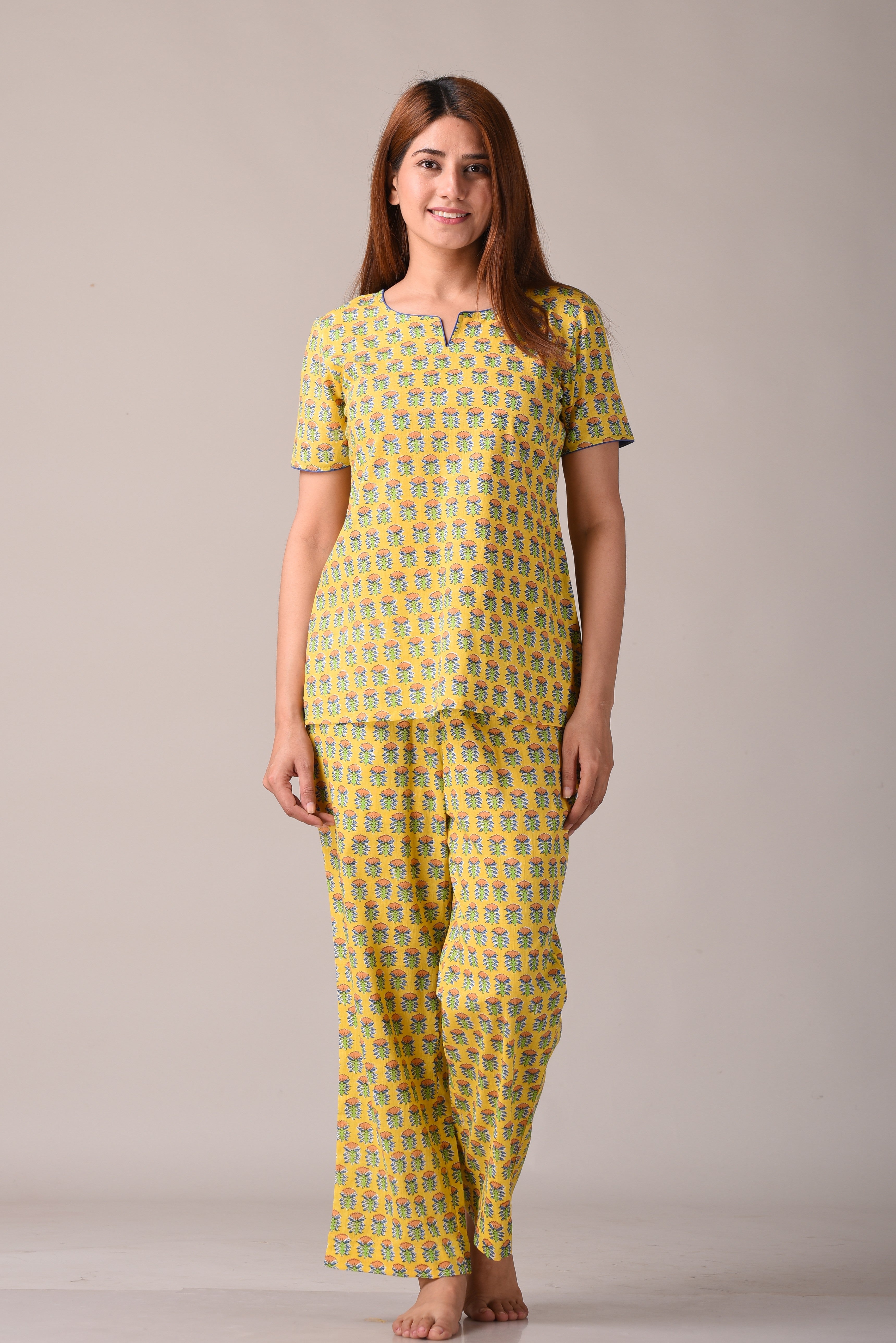 Yellow Paisley Printed Pure Cotton Nightsuit and Loungewear (Top & Pyajama Set)